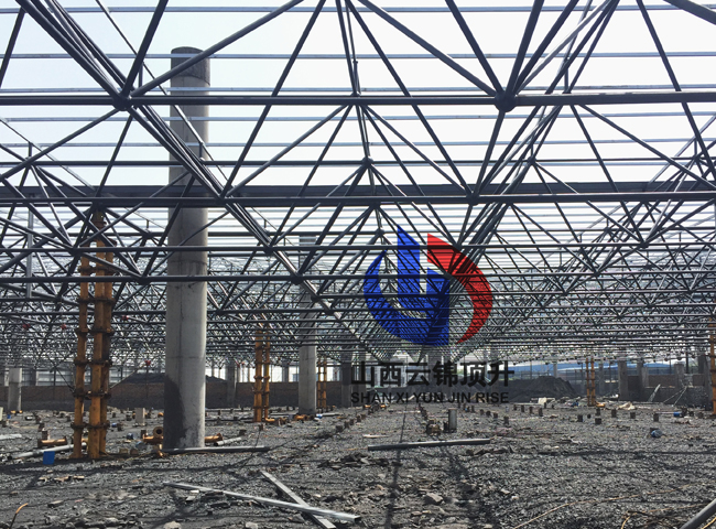 在已成形的下弦平面的基础上安装每排的竖向腹杆和上弦球,由于该网架的结构矢高较大,上,下弦高差达4米多,故安装员在下弦位置处无法调节和安装上弦球,因此,我们先在脚手架平台上,先将上弦球与竖向腹杆焊接起来,焊接时确定好两者间的相对位置,确保竖向腹杆与上弦球的连接焊缝对称分布在上弦球对接焊缝两边,再在相应的安装位置处设置一带有吊钩的组合钢脚手平台,其高度与该安装位置处的网架矢高高度一致,一安装人员在下弦位置处,另一人登上组合钢脚手平台,用手动牵引葫芦将焊接好上弦球的竖向腹杆吊起,吊点设置在上弦球上,利用上弦球与竖向腹杆的自重,使竖向腹杆自动垂直于下弦球顶部,上下两施工人员,相互配合,进行局部微调,确定好竖向腹杆位置后,下部的施工员,立即将其点焊定位,(参见附图1和附图2),并同时安装两排平面网架之间的斜腹杆,利用该斜腹杆微调竖向腹杆与球面的垂直度,并利用该斜腹杆稳定住竖向腹杆和上弦球,再安装上弦杆,在这起始的两两相对的四个支承座范围内从中间网格开始向两边一排一排向前有序拼装推进。