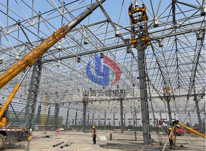钢网壳结构单层、双层钢网壳,曲面空间受力体系,整体协同性好,高空作业难度大,非常适合地面拼装、整体同步提升就位。